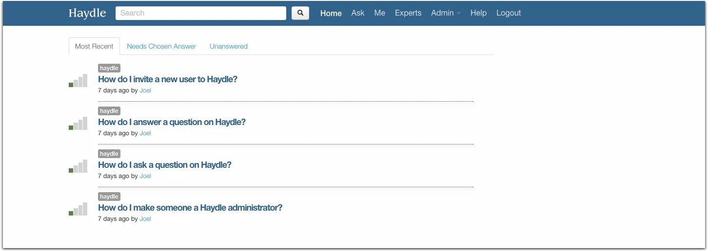 Haydle is a solution for the issues of knowledge retention and capturing tribal knowledge within an organization. Currently, subject matter experts are constantly bombarded with repetitive questions from a variety of coworkers. Haydle provides a place for everyone within an organization to ask and answer questions related to the business; it is the single best place to ask and answer any question. Adoption of Haydle will provide tangible benefits to productivity, information retention, communication, and employee lifecycles. The platform connects people to find answers.