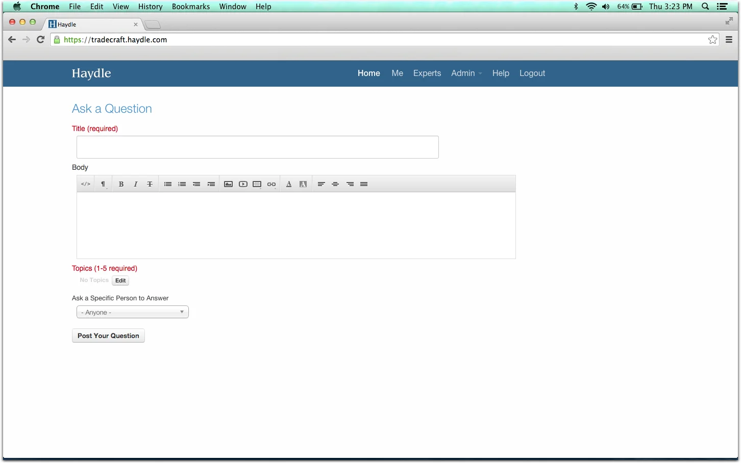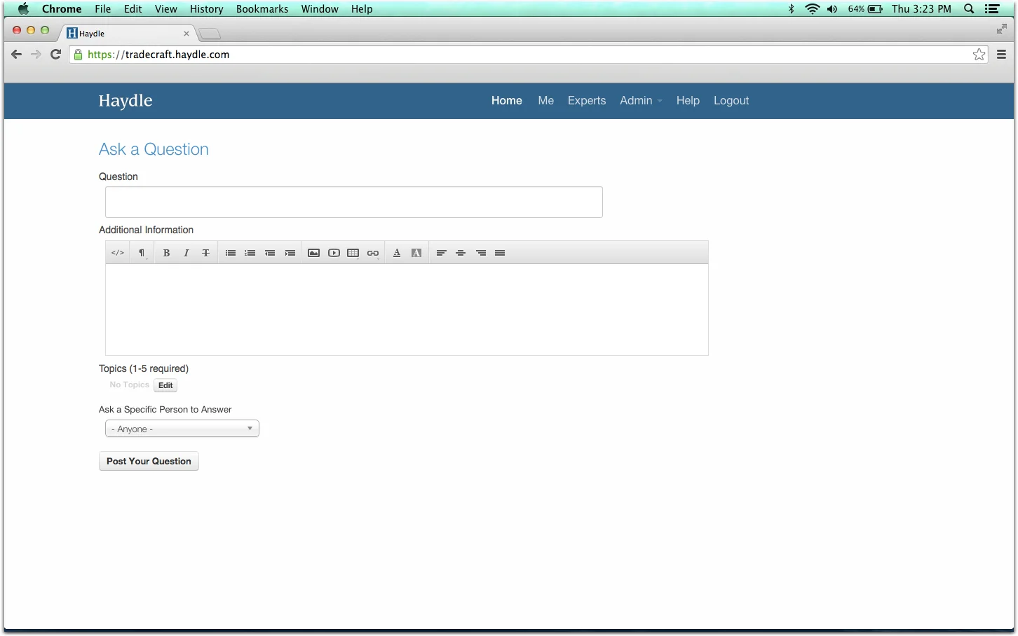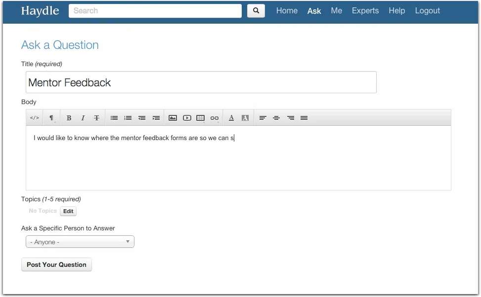 Due to the fact that Haydle is an internal tool for companies to capture and disseminate information, I invited members of the Tradecraft team to sign up for our own internal account. These colleagues were not involved in the project and were not members of the design team. I asked them to sign-up at a scheduled time where I could record and observe their initial experiences with Haydle. The task presented was to post two questions on the forum for the participants colleagues to see.