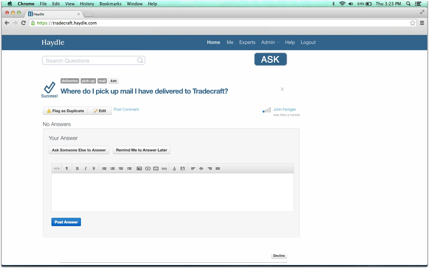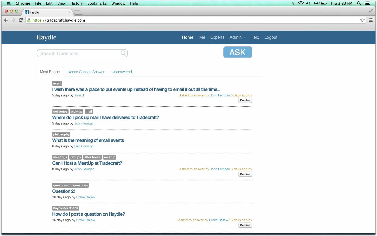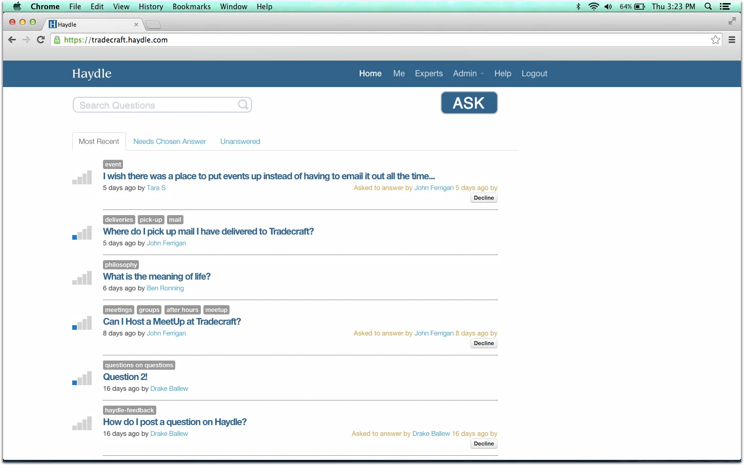 Due to the fact that Haydle is an internal tool for companies to capture and disseminate information, I invited members of the Tradecraft team to sign up for our own internal account. These colleagues were not involved in the project and were not members of the design team. I asked them to sign-up at a scheduled time where I could record and observe their initial experiences with Haydle. The task presented was to post two questions on the forum for the participants colleagues to see.