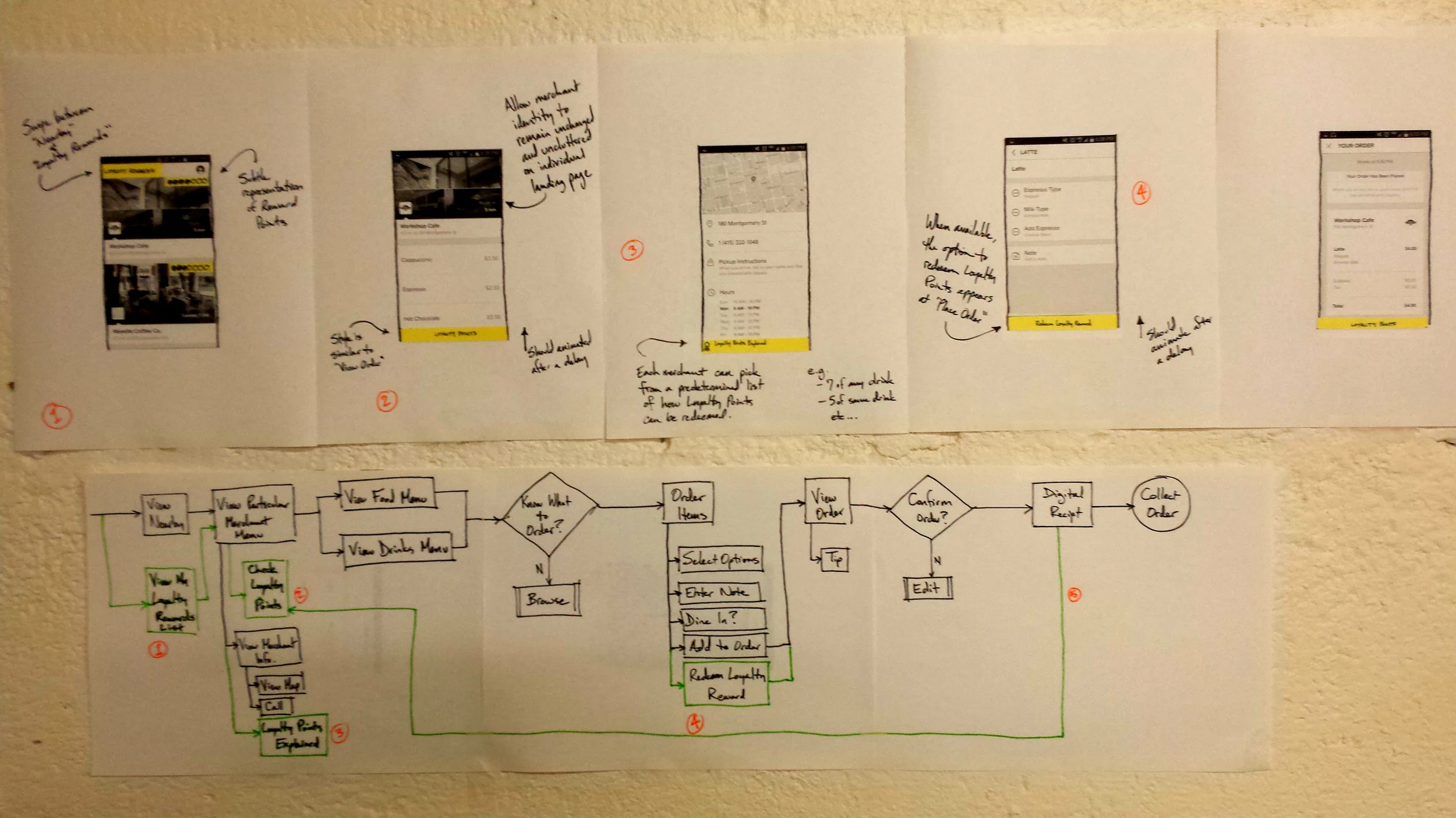 Since the task flows could be varied based on location and were presenting multiple opportunities to incorporate my proposed feature, I moved to a more iterative medium for visual representation. By creating the flow with post-its on the wall, I was able to create different customer experiences extremely quickly and not develop attachments to certain solutions. This was a major step in understanding how the flow could develop.