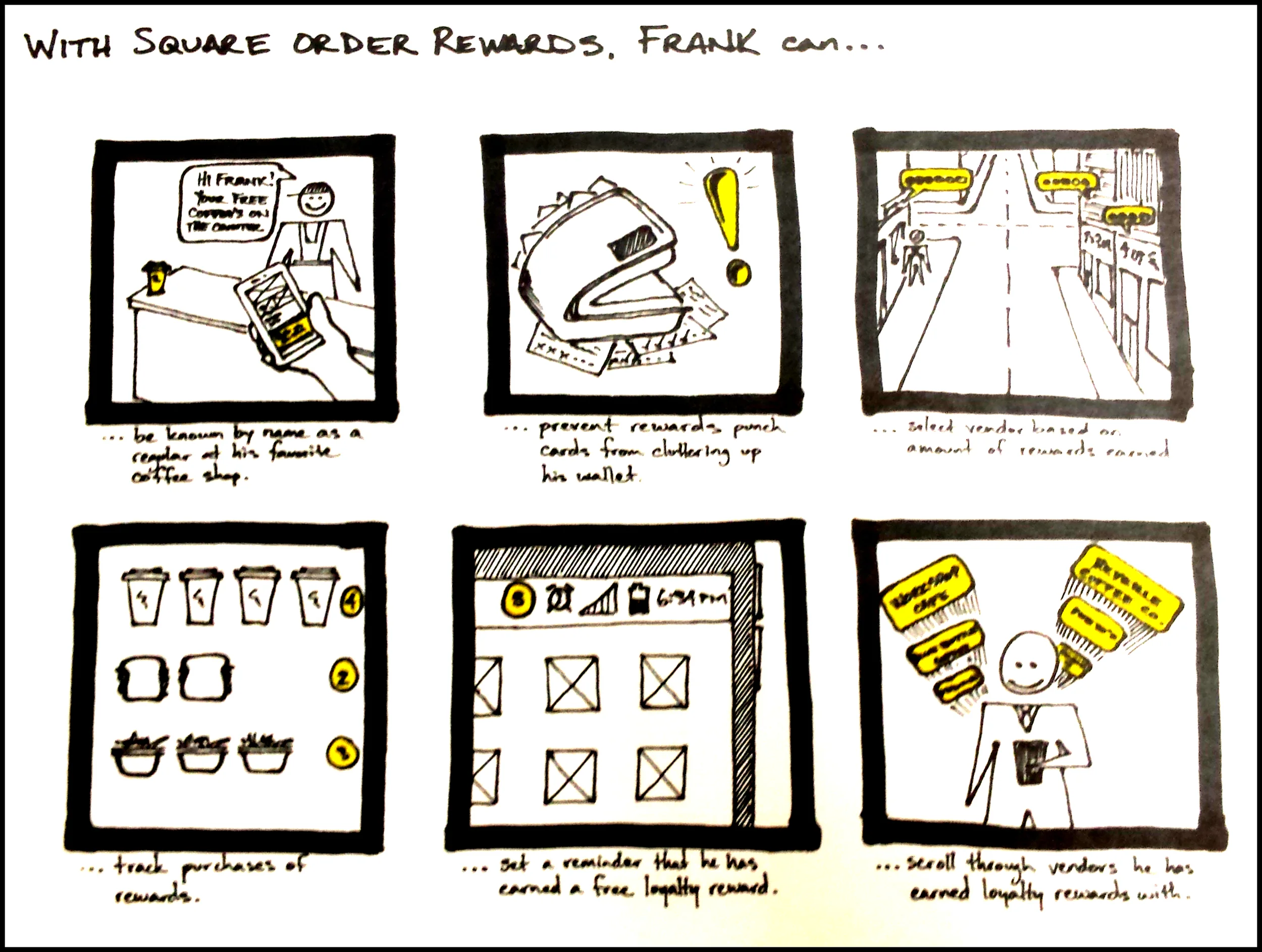 At this point, I returned to my provisional persona, Frank, and revisited the design stories that helped to form him. After creating Frank in the midst of both visual and descriptive design stories, I redeveloped those same concepts in order to tighten up the narrative of what Square Order Rewards would be. The provisional persona was edited along with the critical design stories and this led to provisional UI sketches and UI flows.